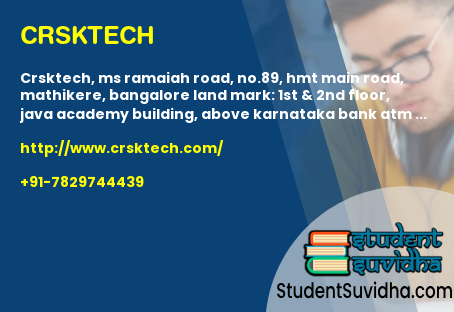 CrskTech, MS Ramaiah Road, No.89, HMT Main Road, Mathikere, Bangalore Land Mark: 1st & 2nd Floor, JAVA ACADEMY BUILDING, Above Karnataka Bank ATM Above Smitha Stores, Near Domino's Pizza, next to Sangeetha Mobiles, Mathikere, Bengaluru, Karnataka 560054, India
